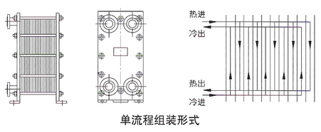 According to the temperature difference and flow rate of medium, plate heat exchanger can be assembled into single-flow, double-flow, three-flow and multi-flow forms. Single process means that the medium flows through one process in the heat exchanger, and double process means that the medium turns back and flows through two processes in the heat exchanger, and so on. The outline diagram of each process and its schematic diagram are shown in Figure 3. When multiple processes are adopted, the four interfaces of the heat exchanger cannot be located on the same clamping plate, and the inlet and outlet should be located on the front and rear clamping plates.